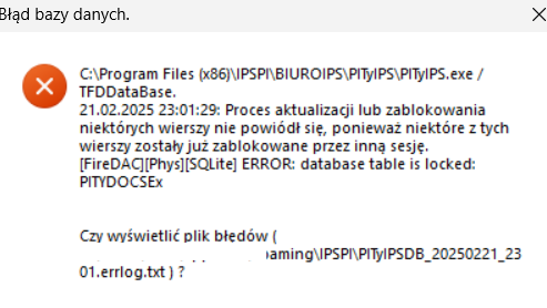 Tu jest komunikat o blokadzie przez inną sesję. Czy w tym czasie nikt innych nie korzystał z innego stanowiska z tej bazy?