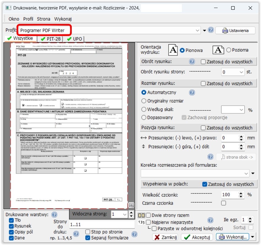 Jeśli aktualizacja Windows zmieniła coś z drukarkami, to proponuje po otworzeniu rozliczenia do wydruku zrestartować ustawienia profilu i formularzy.