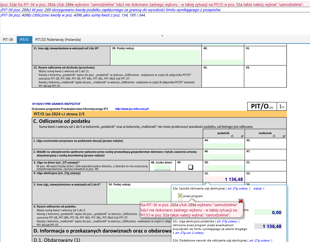 najnowsza wersja, wg mnie pojawił się niepotrzebny błąd, wysyłam screen. Gdy wpisujemy dochód zagraniczny metodą proporcjonalną i korzystamy z ulgi abolicyjnej pojawia się błąd jak na screenie w załączeniu. (dotyczy też zeznań wspólnych gdzie drugi małżonek ma tylko polskie dochody)