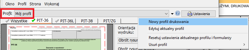Jak wybierzemy inny profil niż "Najpierw nieparzyste" i PIT-38, to będzie takie ustawienie jakie na nim było dokonane.