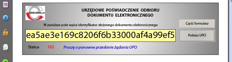 Przypominam, że wcześniej ustaliliśmy jaki tekst zostaje wysłany z e-Deklarcji gdy nie ma nadanego identyfikatora: "101Proszę o ponowne przesłanie dokumentu". Wynika z niego, że w takim przypadku należy powtórzyć wysłanie danych. Proponuję poczekać do poniedziałku.
