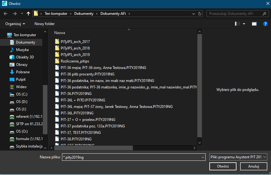 Przy próbie otwarcia pliku (Program > Otwórz) program nie pokazuje nic, tzn. pewnie pokazałby pliki programu Asystent PIT, ale takich nie mam, natomiast nie pokazuje plików programu PITy 2019 IPS (z rozszerzeniem .PITY2018NG, .PITY2017NG itd.).