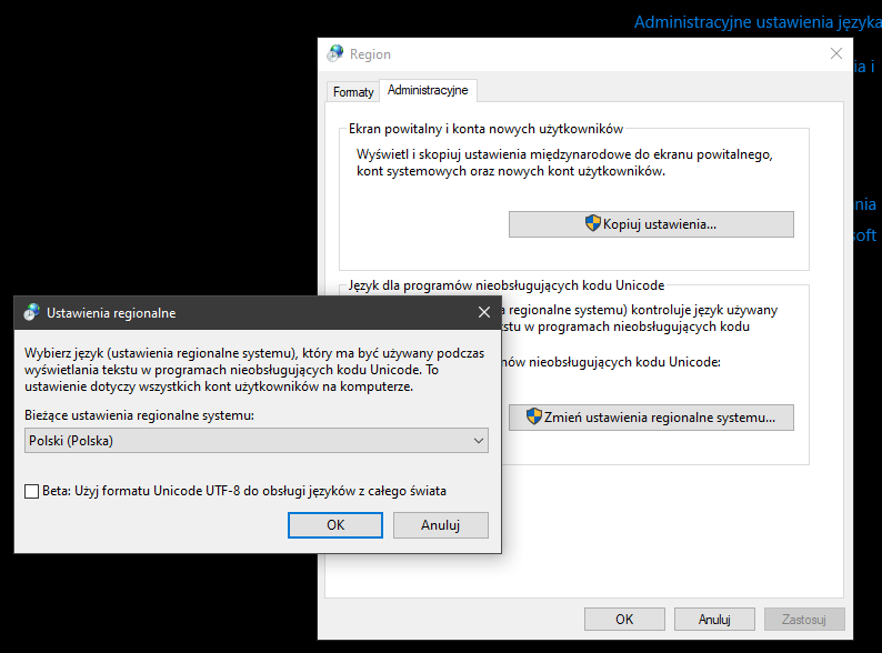 Ma być Język dla programów nieobsługujących kodu Unicode - Polski.