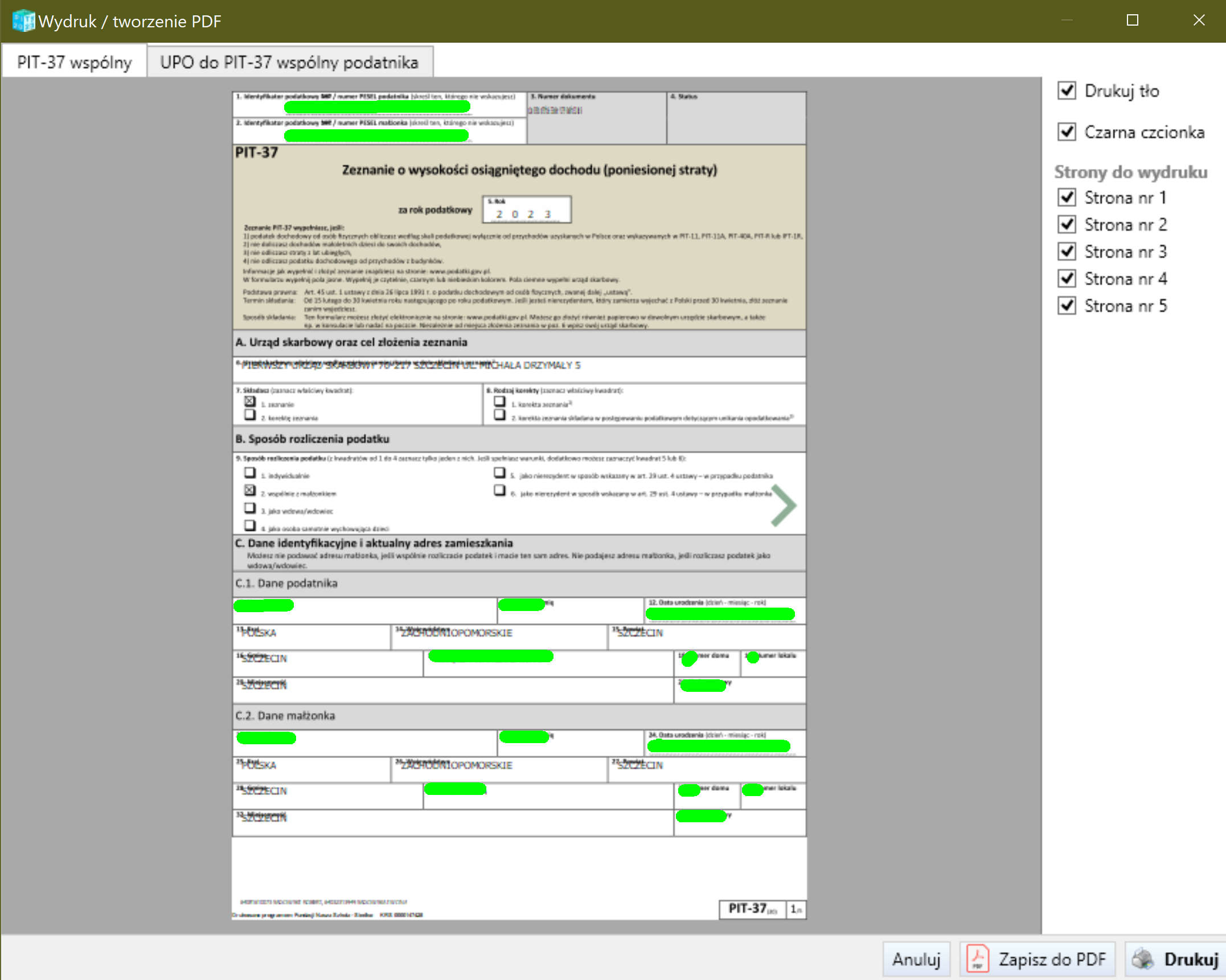 - ekran wydruku do PDF/pliku (proszę zwrócić uwagę na wielkość identyfikatora w polu 3. Numer dokumentu),