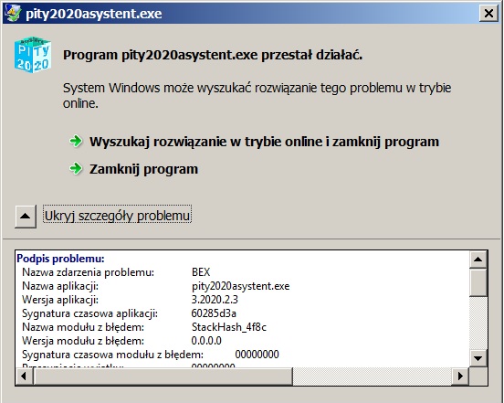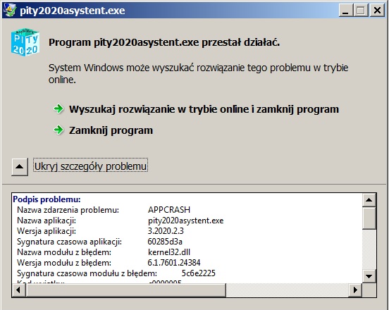Komunikat: Application Error Exception EAccessViolation in module pity2020asystent.exe at 00000000. Access violation at address 00000000 in module ‘pity2020asystent.exe’. Read of address 00000000.
