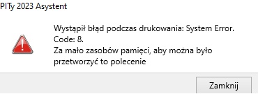 "Wystąpił błąd pdoczas drukowania": System Error. Code: 8. Za mało zasobów pamięci, aby można było przetworzyć to polecenie."